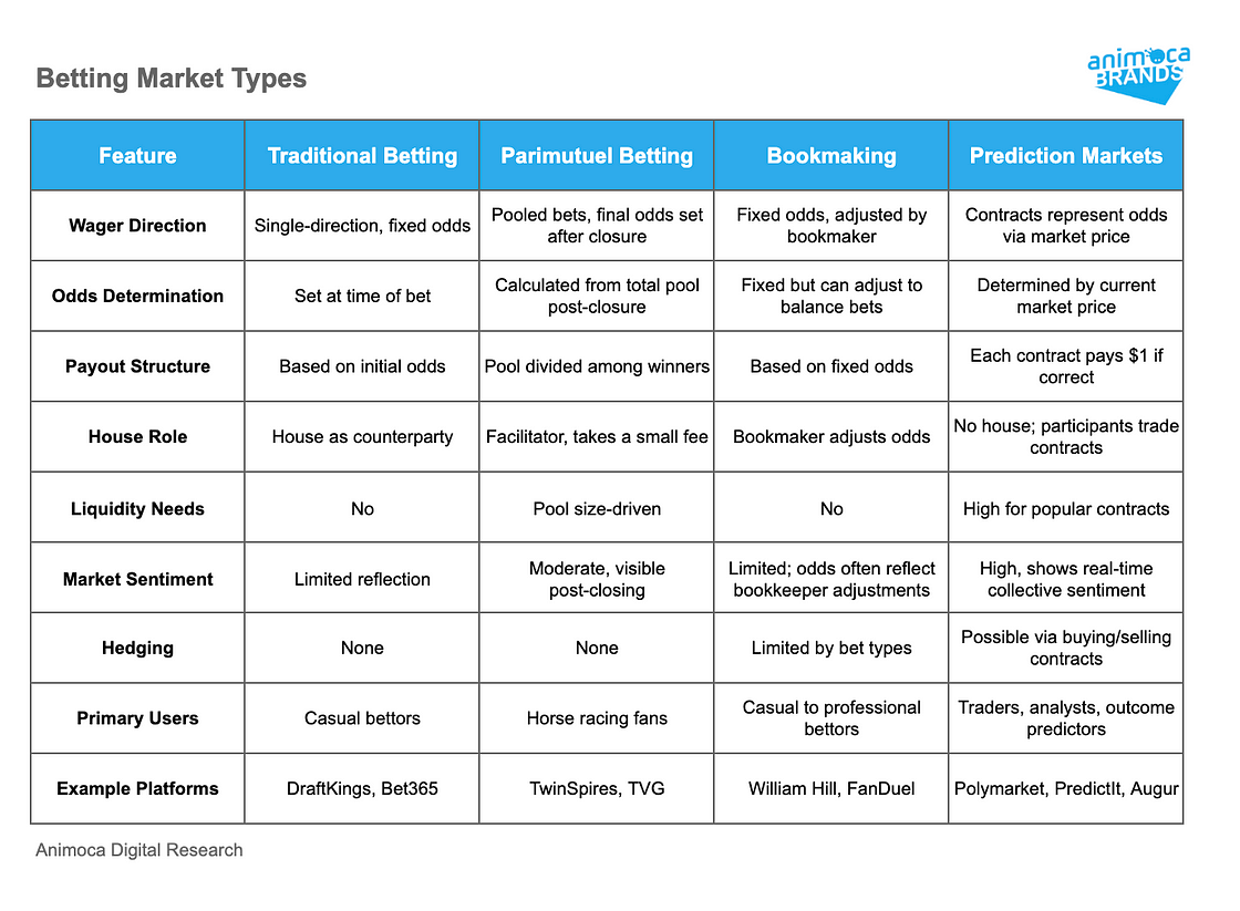 预测市场与传统博彩市场有几个关键的不同点。首先,预测市场是双向交易市场,允许参与者在事件结果确定之前随时退出他们的仓位。其次,预测市场会不断更新共识赔率,实时反映公众情绪,而传统博彩商则主要通过调整赔率来平衡投注池,以确保博彩公司最小化潜在损失。这种做法往往会导致博彩公司过度修正赔率,扭曲了事件的真实概率。