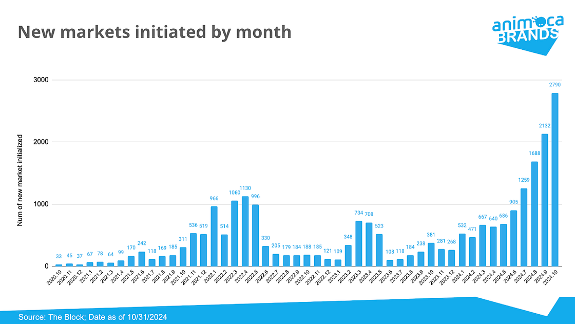 Polymarket团队负责创建新市场,并在此过程中考虑社区的意见。在2021年底和2022年初,团队曾尝试每月推出最多2000个市场,可能是为了增加用户参与度。然而,这一快速的节奏最终逐渐稳定在每月几百个市场。从2024年1月开始,市场创建再次激增,呈现指数式增长,表明最近新增的市场得到了用户的广泛认可和积极反馈。