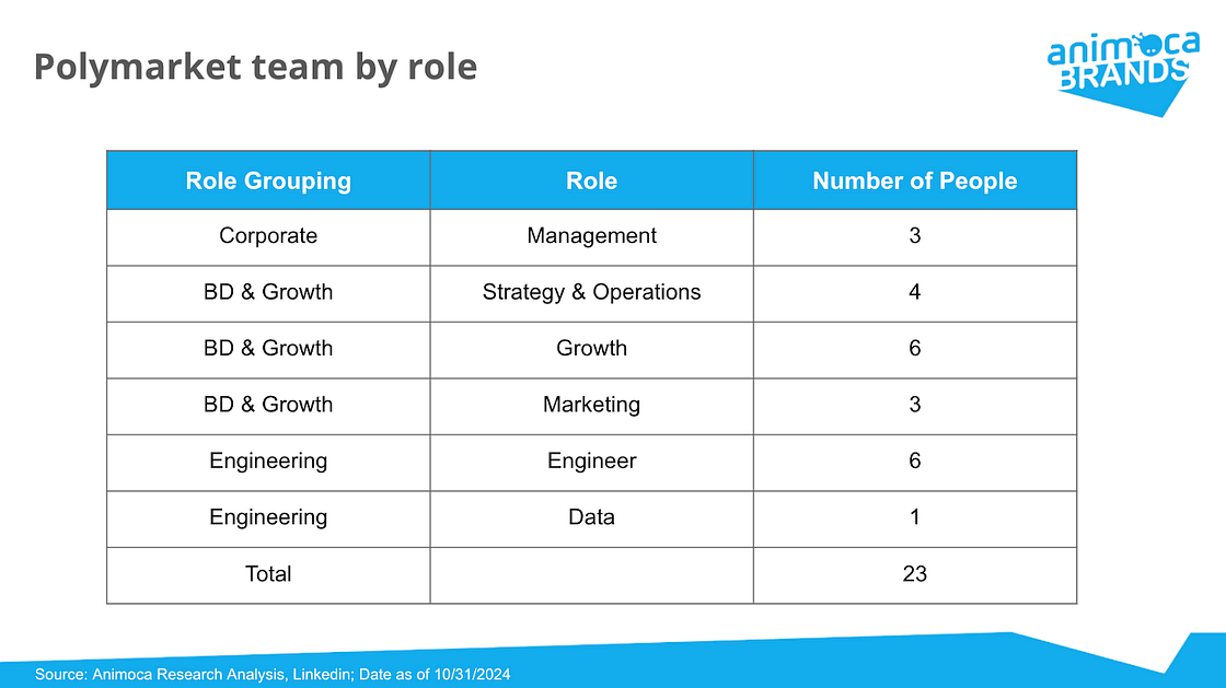 Polymarket的团队规模随着时间的推移发生了变化。公司初创时只有四名员工,在2020年取得初步成功后,团队迅速扩展,到2022年中期已达到约20名员工。然而,2022年下半年,由于CFTC调查的影响,团队规模缩减,并保持精简结构,直到2024年初。