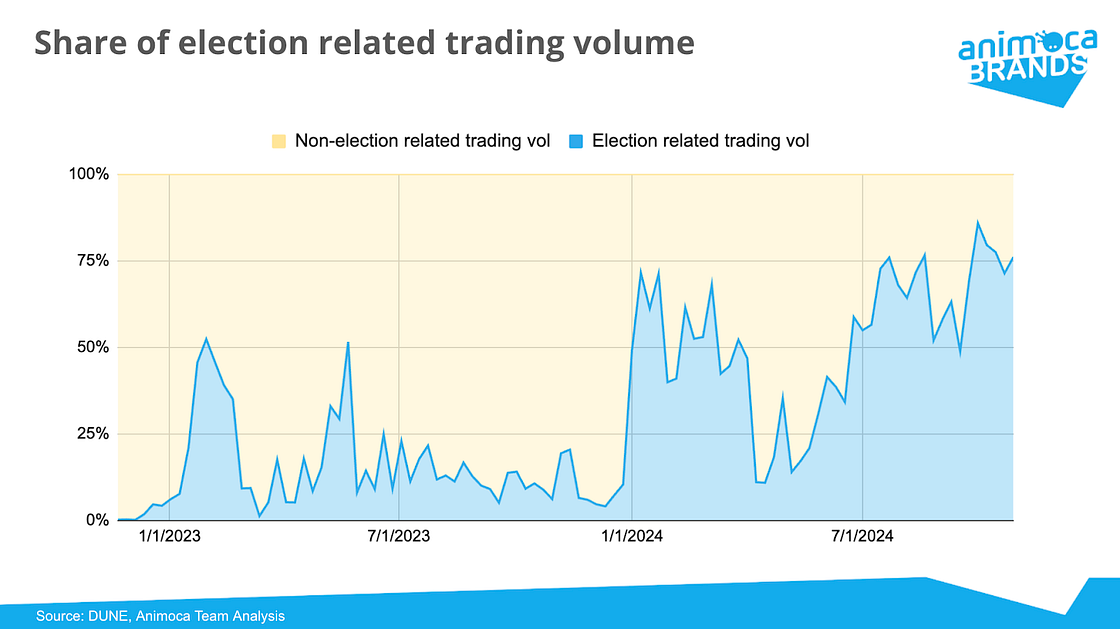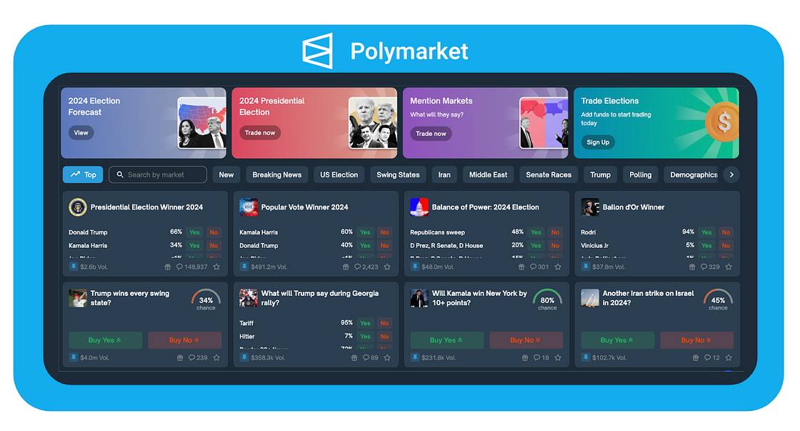 Polymarket通过其总统选举预测市场填补了这一空白。候选人活动和民意调查等新信息会立即反映在事件的未来价格中。这种量化和即时更新的特性帮助Polymarket迅速赢得了人气,并成为社交媒体讨论选举时的常用参考。