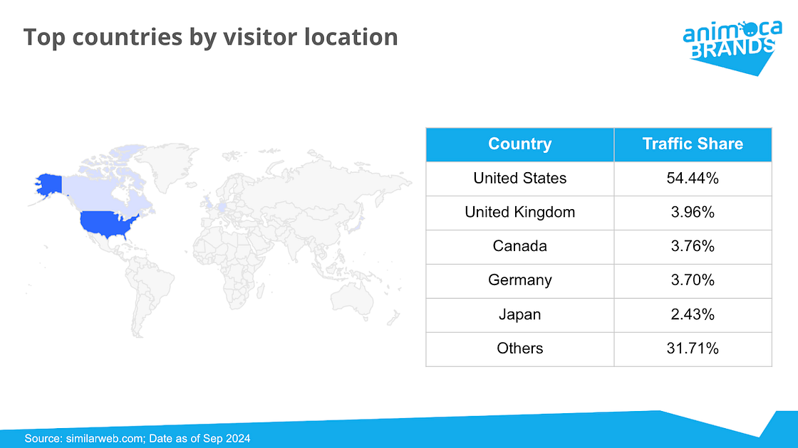Polymarket的主要流量来源是直接通过URL访问,这表明大多数用户在访问之前已经对该平台有所了解。另有30%的访客通过自然搜索进入,说明很多用户是专门通过搜索Polymarket的名称来访问网站的。社交媒体则贡献了约5%的流量,其中Twitter是主要来源,这也与Twitter在加密货币和选举讨论中的活跃角色相契合。