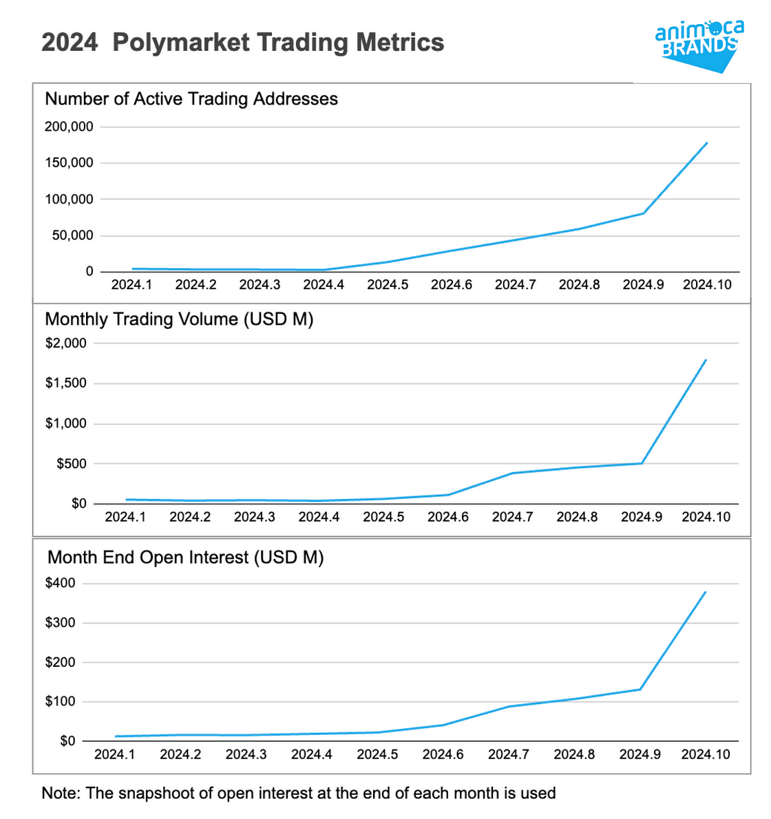 在整个2024年选举周期内,Polymarket的月交易量飙升,从几百万美元增长到1月的5000万美元,7月达到了近4亿美元,到了10月则轻松突破了10亿美元。总的未平仓合约量 — — 即锁定的USDC以及如果所有合约结算时可能的支付金额 — — 从2024年1月1日的700万美元增长至11月1日的约4亿美元。这笔锁定的资金超过了TON的总TVL,使Polymarket在按锁仓量计算的区块链基础设施生态系统中排名第18。