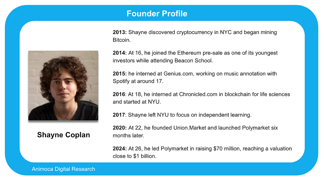 Shayne Coplan,创始人兼首席执行官:Shayne是纽约人,15岁时便进入Web3领域,开始比特币挖矿。2017年,他从纽约大学辍学,随后在2020年启动了market,并于同年推出Polymarket。