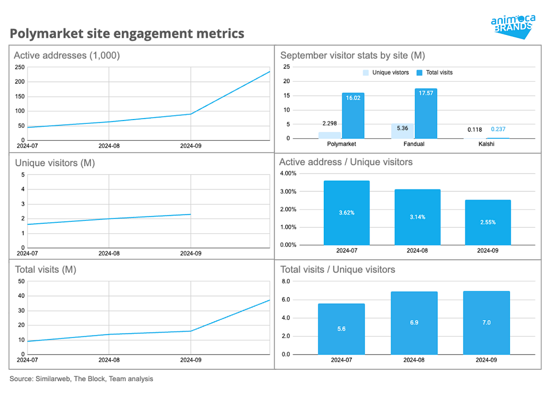 此外,访问次数与独立访客数的比例显示,网站访客平均每月访问网站七次,表明Polymarket用户的参与度和粘性较高。这种高流量和高参与度的结合,凸显了Polymarket不仅作为一个交易平台的潜力,还可能成为广泛信任的重大事件预测信息来源。