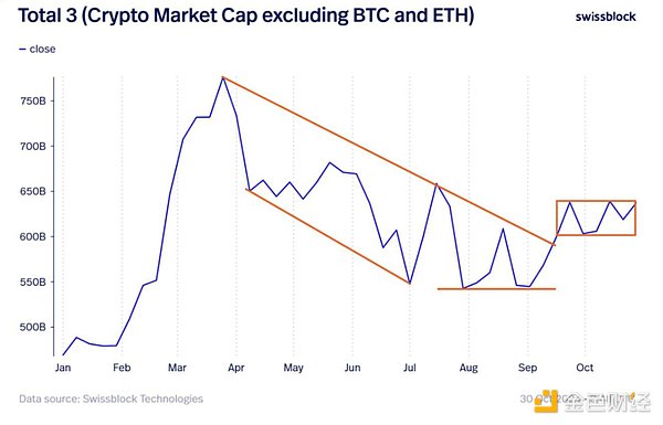 下图为今年以来排除比特币与以太币的加密市场总市值变化 (Total 3),该图也代表山寨币能够爆发与否。可以看到在今年 4 - 9 月期间,整体山寨币市值呈现大幅下跌趋势,由 7500 亿美元跌至 5500 亿美元,但从九月开始,可以在图表上看到市值止跌回升,从 5500 亿美元上升至 6000 ~ 6500 亿美元区间,打破了下降趋势,也代表我们已经度过山寨币最低迷的时期。