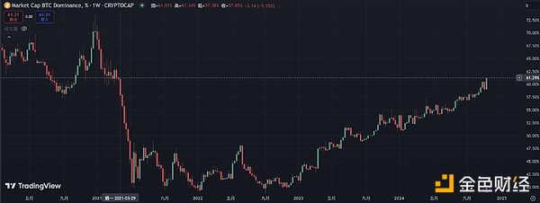 而前文所提及的 BTC.D,目前已接近 61%,为本周期以及三年半以来新高,根据过往经验,山寨季的启动都会先由比特币上涨吸血山寨币,从而使 BTC.D 飙升,当上涨至一定位阶时,BTC.D 便会从高点跌落至 50%~55% 区间,山寨币种补涨,而我们现在正处于 BTC.D 飙升至顶峰的周期当中。