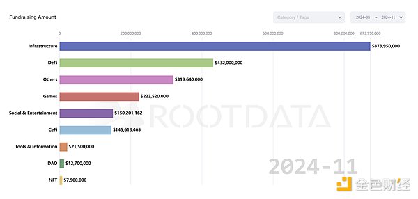 近三个月以来,融资金额围绕在基础设施当中,共完成 8.7 亿美元融资,基础设施为加密市场融资版图当中的重点赛道,因区块链仍在早期发展阶段,因此投资方对于打造基础设施抢先卡位仍颇感兴趣。可以着重观察当中第二、三名赛道,分别是 DeFi 与其他 ( 通常意指应用 DApps),前者总融资额达 4.3 亿美元,后者则是 3.1 亿美元,狠狠甩开其他赛道。