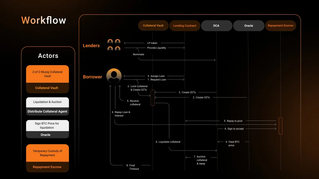 在借贷过程中,DLC 通过初始的 2-of-2 多签锁定抵押物,根据事件结果生成预签名的交易(CETs),当预言机揭示清算价格后,DCA(Distributed Collateral Agent,与用户共同持有 2-of-2 多签的组件)即可花费该 UTXO 来进行抵押物的清算折扣拍卖,让外部竞标者来偿还流动性池。因此,Side 得以实现了 BTC 作为抵押物时的非托管借贷,即除了清算的场景,任何其他情况下挪用抵押物都需要用户本人的同意。