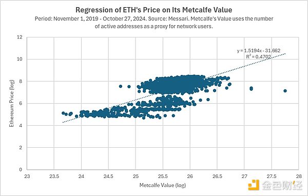 在过去三年中,以太坊费用(以 ETH 为单位)与 ETH 价格之间的关系在统计学上非常显著,每周的相关性为 48%。如果以太坊产生的费用在一周内下降 1000 ETH,那么 ETH 价格平均贬值 17 美元。