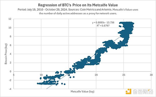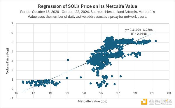 在 Web3 中,协议的价值取决于其平台上的整体活动量,取决于拥有最活跃的构建者和用户生态。下面是我们对比特币、以太坊和 Solana 的代币价格与梅特卡夫值(衡量网络中用户数量的指标)之间关系的分析。在所有情况下,代币价格都与梅特卡夫价值高度相关,这种关系持续了数年,而就比特币而言,这一关系已经持续了十多年。