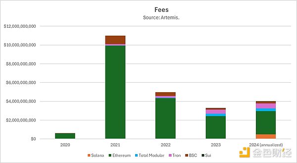 然而,如果考虑到以太坊模块化策略带来的所有新「模块化」代币的市值,情况就会发生变化。2023 年,这一数字增长了 510 亿美元,与 Solana 的市值增长基本持平。