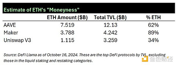 但是,ETH 是否真的受益于「以太坊生态」的主导地位吗?或者说,以太坊及其模块化部分正在蓬勃发展,但并没有将 ETH 本身作为一种资产?事实证明,ETH 是更广泛的以太坊生态中无处不在的一部分。当以太坊扩展到 L2 时,ETH 也是如此。大多数 L2 使用 ETH 支付 gas,而且大多数 L2 TVL 中的 ETH 至少是其他代币的 10 倍。观察下表,就可以了解以太坊生态中三个最大的 DeFi 应用在其主网和 L2 实例中 ETH 资产的主导地位。