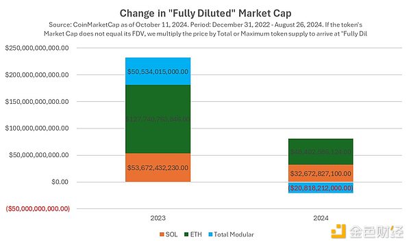 如果把以太坊及其模块化生态的市值加在一起看,情况会发生变化。2023 年,以太坊模块化基础设施代币产生的价值与整个 Solana 的价值差不多,都是 500 亿美元。但在 2024 年,这些代币的整体表现不如 Solana。此外,这些代币的收益主要归团队和早期投资者所有,而非 ETH 代币持有者。