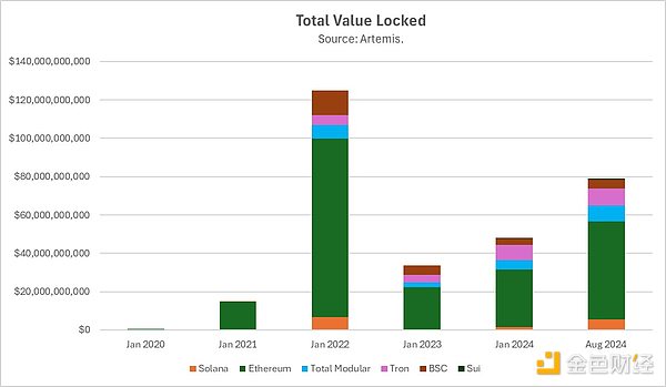 模块化生态发出了强烈的「意见」。2023 年,市场给予与以太坊一致的模块化基础设施代币的增长与给予 Solana 的增长相同,但 2024 年的情况并非如此。