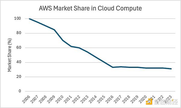 9 年的时间,市场份额从 100% 降到 75%,这已经很不错了!要知道,AWS 在大约同一时期的市场份额从 100% 降至约 35%。