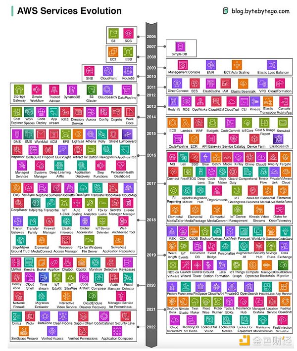 为了更好地理解这一想法有多激进,可以想象一下 Web2 中的情况。与以太坊相似的 Web2 服务是亚马逊网络服务(AWS),它是用于构建中心化应用的领先云基础设施平台。试想一下,如果 20 年前 AWS 刚刚推出时,决定只专注于其旗舰产品,如存储(S3)和计算(EC2),而不是现在提供的几十种不同的服务,AWS 将错失绝佳的创收机会,无法向客户推销其不断扩大的服务套件。有了全套的产品服务,AWS 可能会创建一个「围墙花园」,使其客户难以与其他基础设施提供商集成,从而将其客户锁定。当然,事实就是如此。AWS 现在提供数十种服务,客户很难脱离其生态,收入增长速度也十分惊人(从早期的数亿美元增长到现在的约 1000 亿美元年收入)。