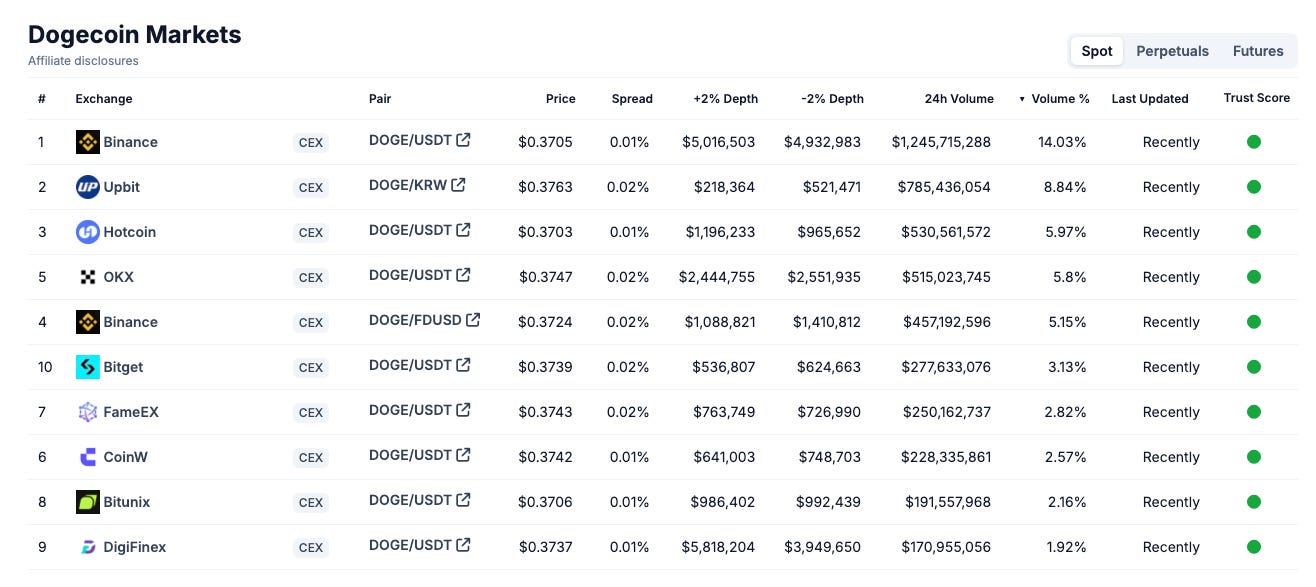 但是,当你看 $DOGE 和 $SHIB 时,Upbit 仍然是第二大现货市场。