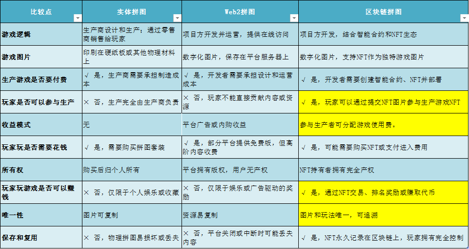 以下是以拼图游戏为例,将实体拼图、web2 拼图,区块链拼图三者做的比较,可以看出来基于区块链拼图的优势。