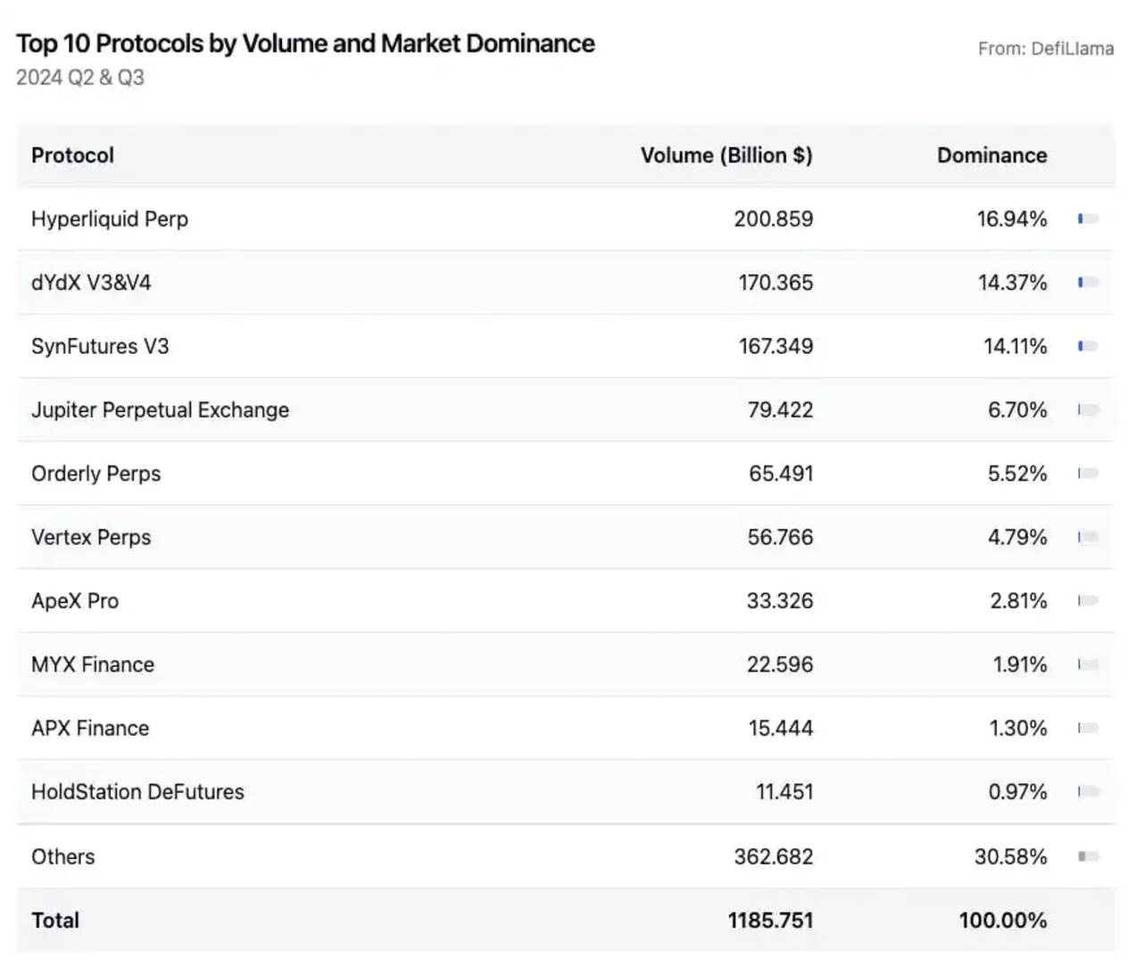 而如果我们把视角放到整个行业,可以看到 SynFutures V3 自上线以来的增长,相比 Hyperliquid、dYdX、Jupiter 等项目也毫不逊色。根据 DefiLlama 数据,Q2、Q3 链上永续合约交易量为 11857亿美金,前 3名占据超过 45%的交易量,分别为 Hyperliquid (16.94%)、dYdX V3 & V4 (14.37%) 和 SynFutures (14.11%)。