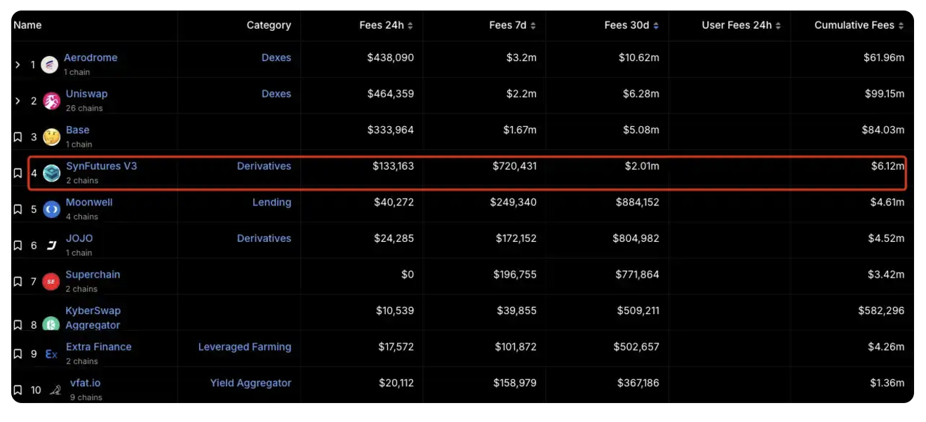 二、SynFutures 上线 Base 后的表现:占据 50% 的市场份额,费用收入在协议里排名第 3