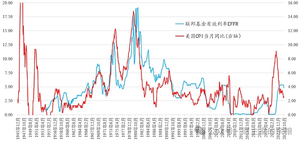 下面这张图表,就是过去70年每天的美国联邦基金利率与每月CPI通胀率的对比情况。