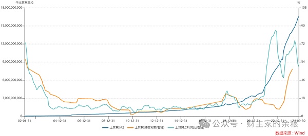所以,印钞和通货膨胀是没有关系的,从2002年到2024年,哪怕土耳其的广义货币供应从458亿里拉暴增到了16.55万亿里拉,通胀也和印钞没有关系,只要土耳其央行能保持低利率,土耳其的通货膨胀就会下去……哪怕印1000万亿里拉的钞票也没问题。