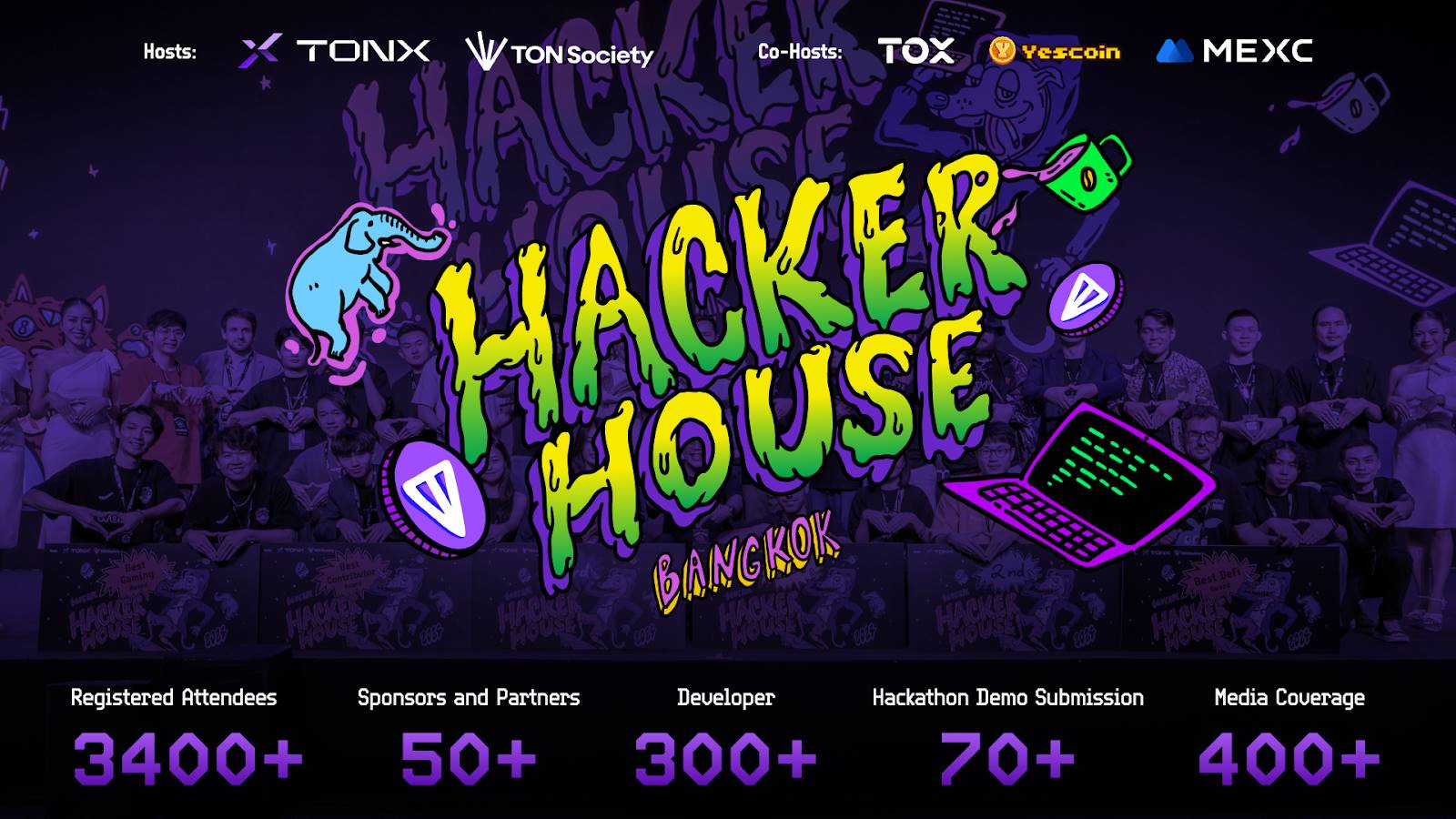 由 TONX 和 TON Society 主办,TOX、Yescoin、MEXC 协办的 TON Hacker House 曼谷站于 11 月 14 日落幕,吸引超过 3,400 名参与者,包括开发者、项目方及行业领袖,共同推动 TON 生态系统发展。