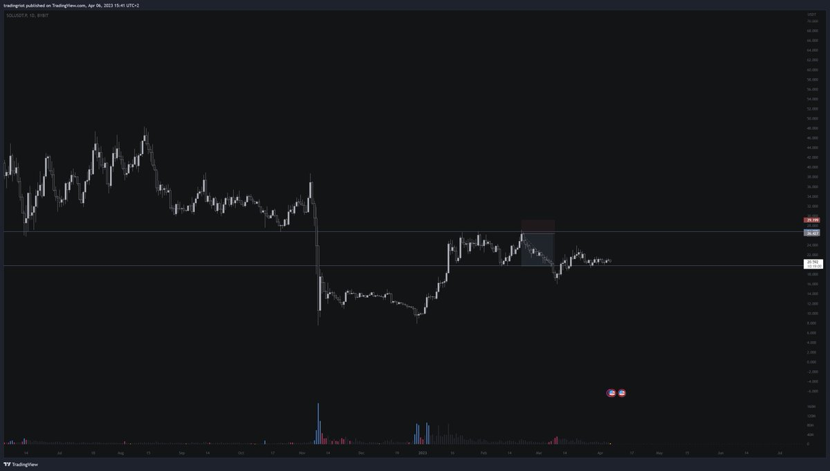 举个例子,2023 年 2 月底,Solana 上涨至日线阻力位后回落,跌至下一个日线支撑位。如果在日线收盘时建立空头头寸,并设置基于 1 日 ATR 的止损,在 18 天内可以实现 2.5 倍的风险回报 (R)。