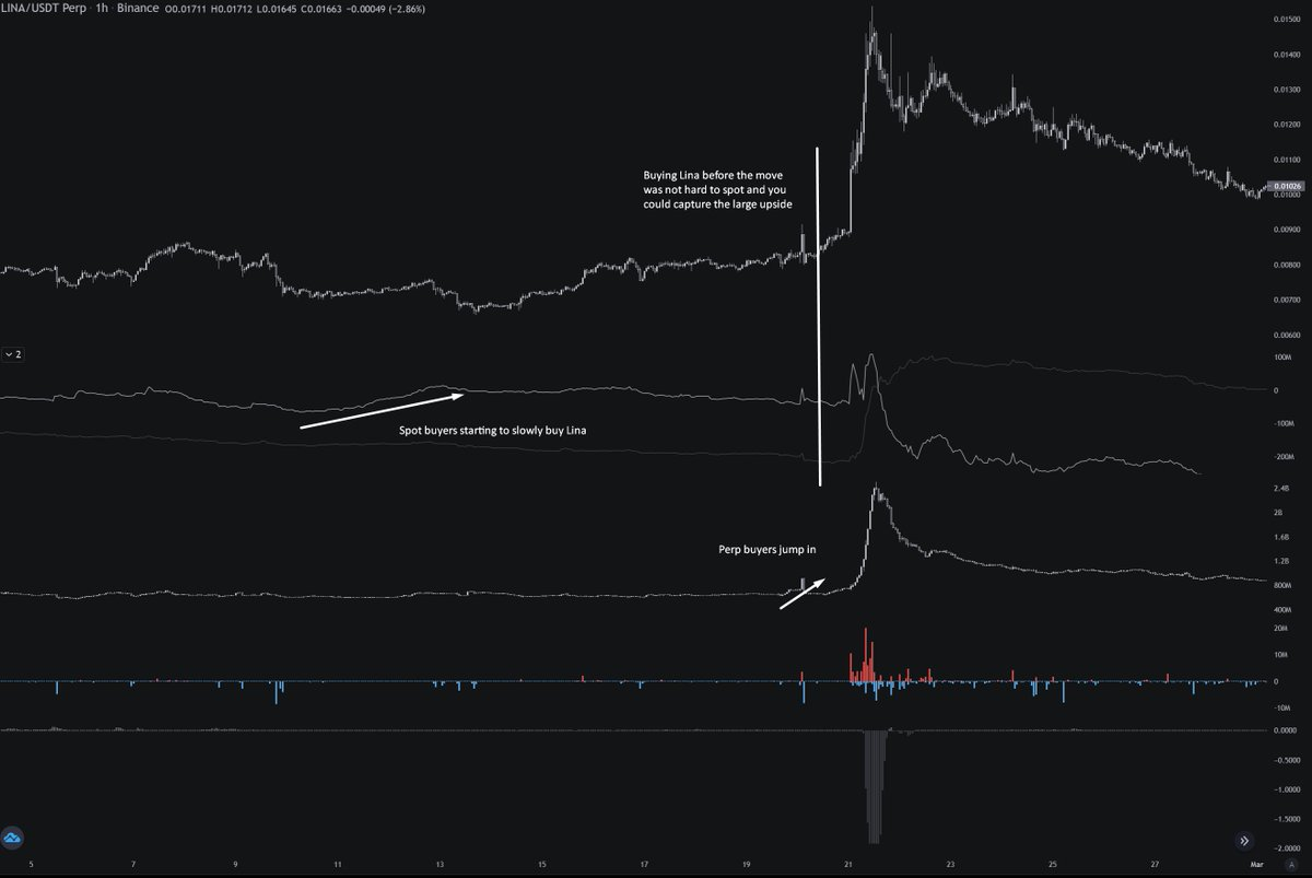 以 Velo 上的 Lina 为例,从图表中可以看到,在突破发生前几天,就已经可以观察到 Lina 的潜在突破信号。