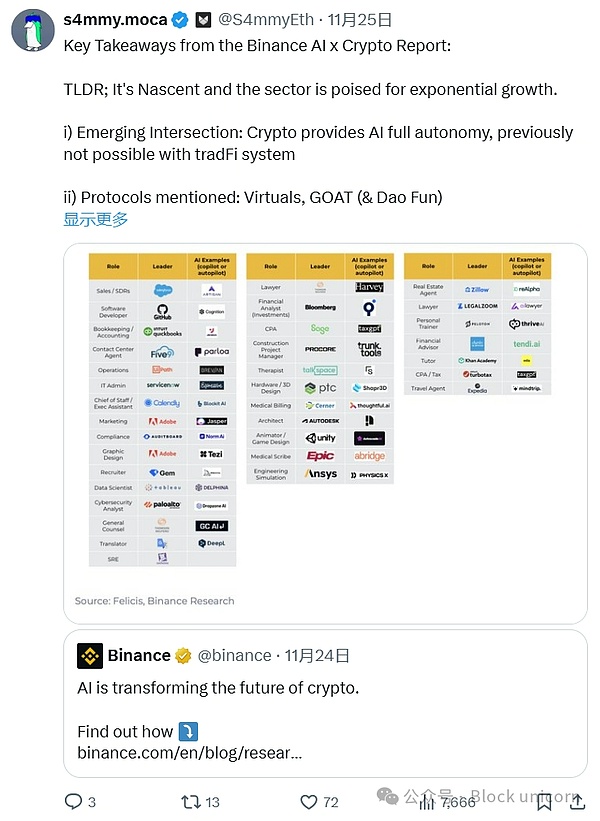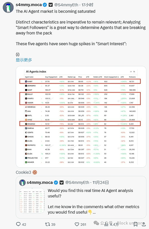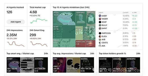 新的发展,例如 @cookiedotfun 的 AI 代理指数,允许用户追踪新兴市场的参与者。