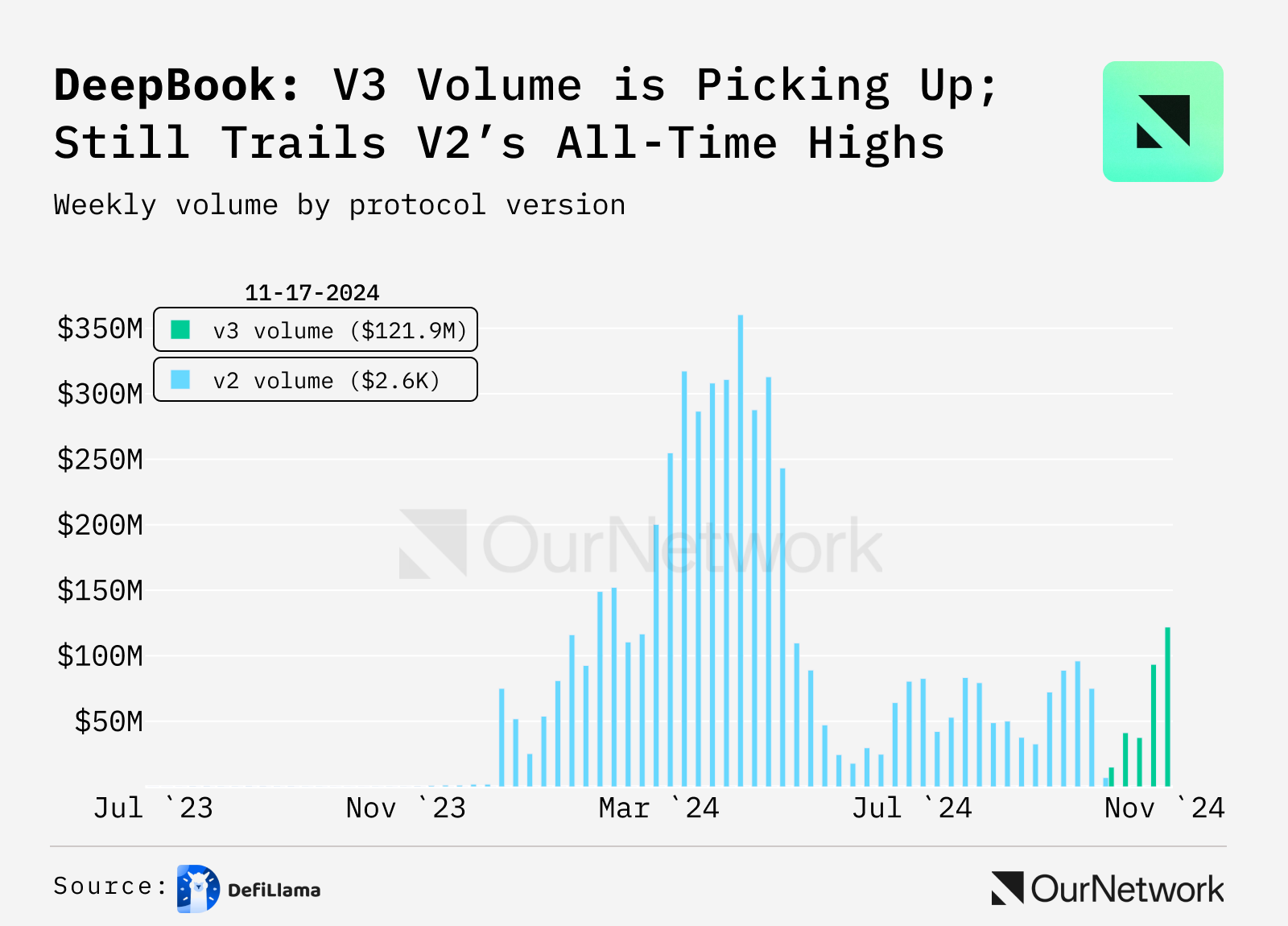 DeepBook 是运行在 Sui 区块链上的中心限价订单簿,自推出以来已累计推动了 55 亿美元的交易量。V3 版本自上线 6 周以来,逐渐展现出活跃的使用趋势。从每周交易量数据来看,V3 推出后交易量达到了 3 个月来的新高 2300 万美元,尽管仍未恢复至 4 月和 5 月的历史高点,但已显示出市场对新版本的逐步接受与信心。