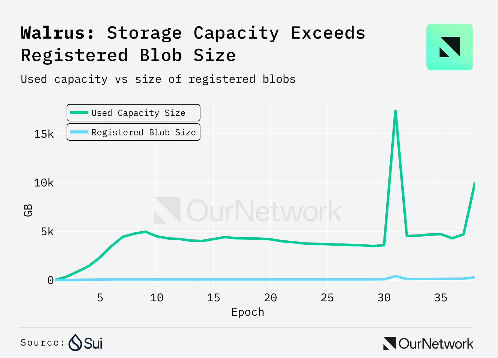 数据显示,Walrus 在存储效率上的表现尤为突出。尽管已注册的 Blob 数据大小始终稳定在 1TB 以下,但实际存储容量峰值已超过 17TB,达到了惊人的 17 倍优化比率。即便在存储需求波动的情况下,实际存储容量仍远超已注册 Blob 的大小,充分展现了 Walrus 在低成本下实现大规模数据存储的能力和潜力。