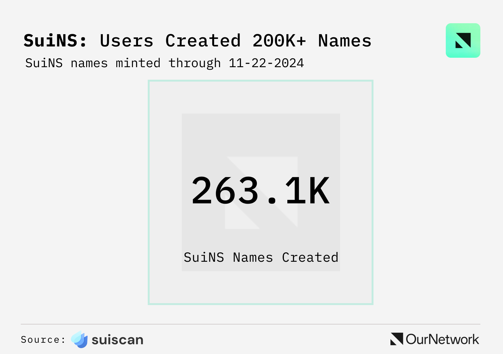 Sui Name Service (SuiNS) 为 Sui 用户提供了一种简单的 @name 格式,用于创建和拥有人类可读且易于记忆的 Web3 名称。这些名称与用户的区块链地址绑定,大幅简化了账户标识的复杂性,为用户带来了更加便捷流畅的使用体验。自服务推出以来,SuiNS 已吸引用户创建了超过 26.3 万个名称,成为 Sui 生态中不可或缺的一部分。