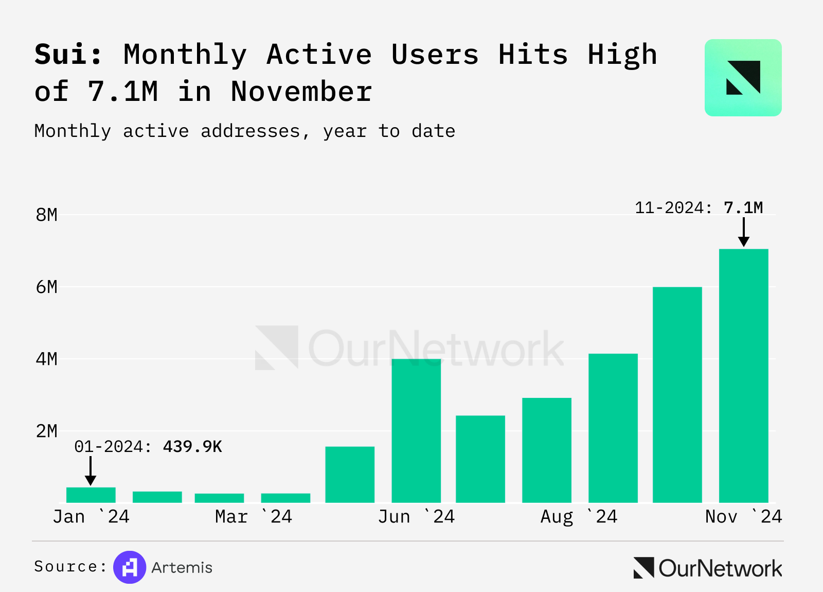自 8 月份的上一期发布以来,Sui 生态发生了一系列令人瞩目的变化:SUI 代币价格暴涨近四倍,市值跻身数字资产前 20 名;全新原生跨链桥上线,有望成为 ETH 流入 Sui 的最大通道;全球第二大稳定币 USDC 也已正式登陆 Sui 网络。此外,Sui 的月活跃用户数在 11 月攀升至 710 万,创下历史新高,进一步巩固了其作为一个强大且可持续发展的区块链网络的地位。