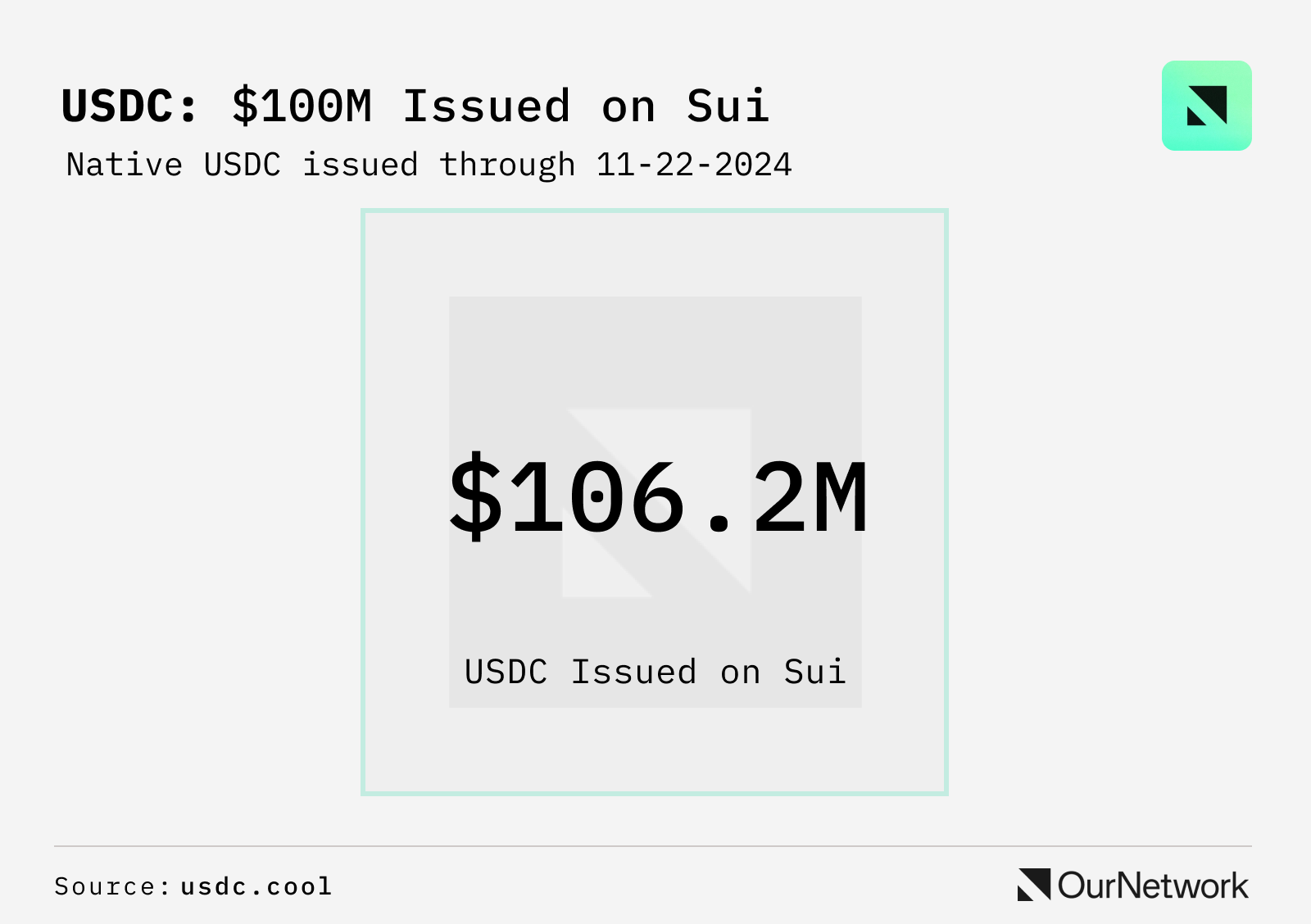 2024 年 10 月 8 日,Circle 推出的原生 USDC 在 Sui 主网上线,用户无需通过跨链桥即可直接使用。仅用了不到两个月的时间,Sui 原生 USDC 的流通量便在 11 月 7 日突破 1 亿美元大关。截至 11 月 22 日,Sui 上的原生 USDC 流通总量已达到 1.062 亿美元,展现了其在短时间内的快速增长和强劲需求。