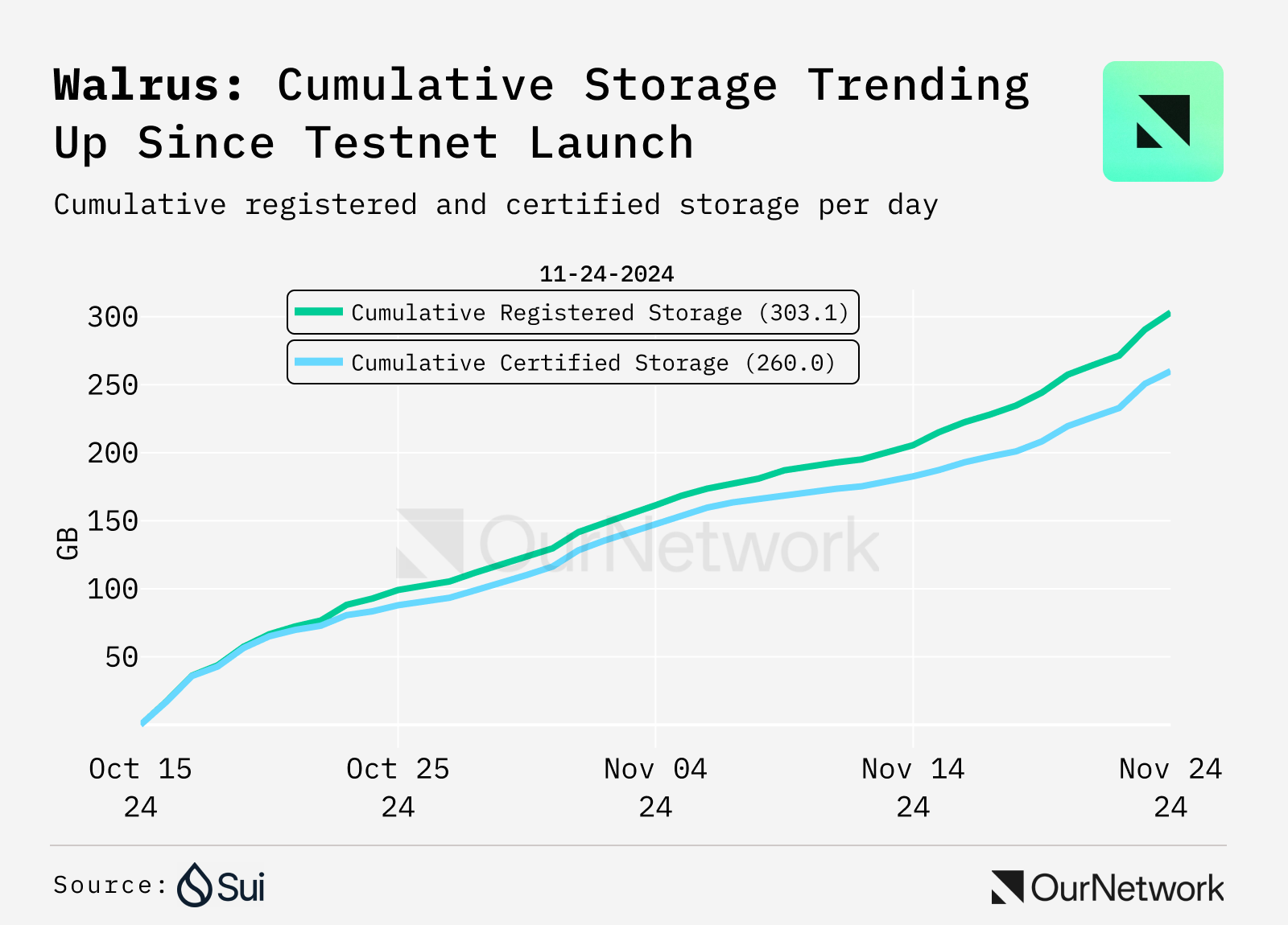 自测试网上线以来,Walrus 的累计存储量持续攀升,这一趋势充分体现了其网络的快速扩张和用户需求的增长。11 月,Tusky(前身为 Akord)正式推出了全新应用,为用户提供去中心化存储与端到端加密的文件存储服务。这一应用的推出不仅显著推动了 Walrus 上数据存储量的增长,也进一步强化了其在安全与隐私保护方面的技术优势。