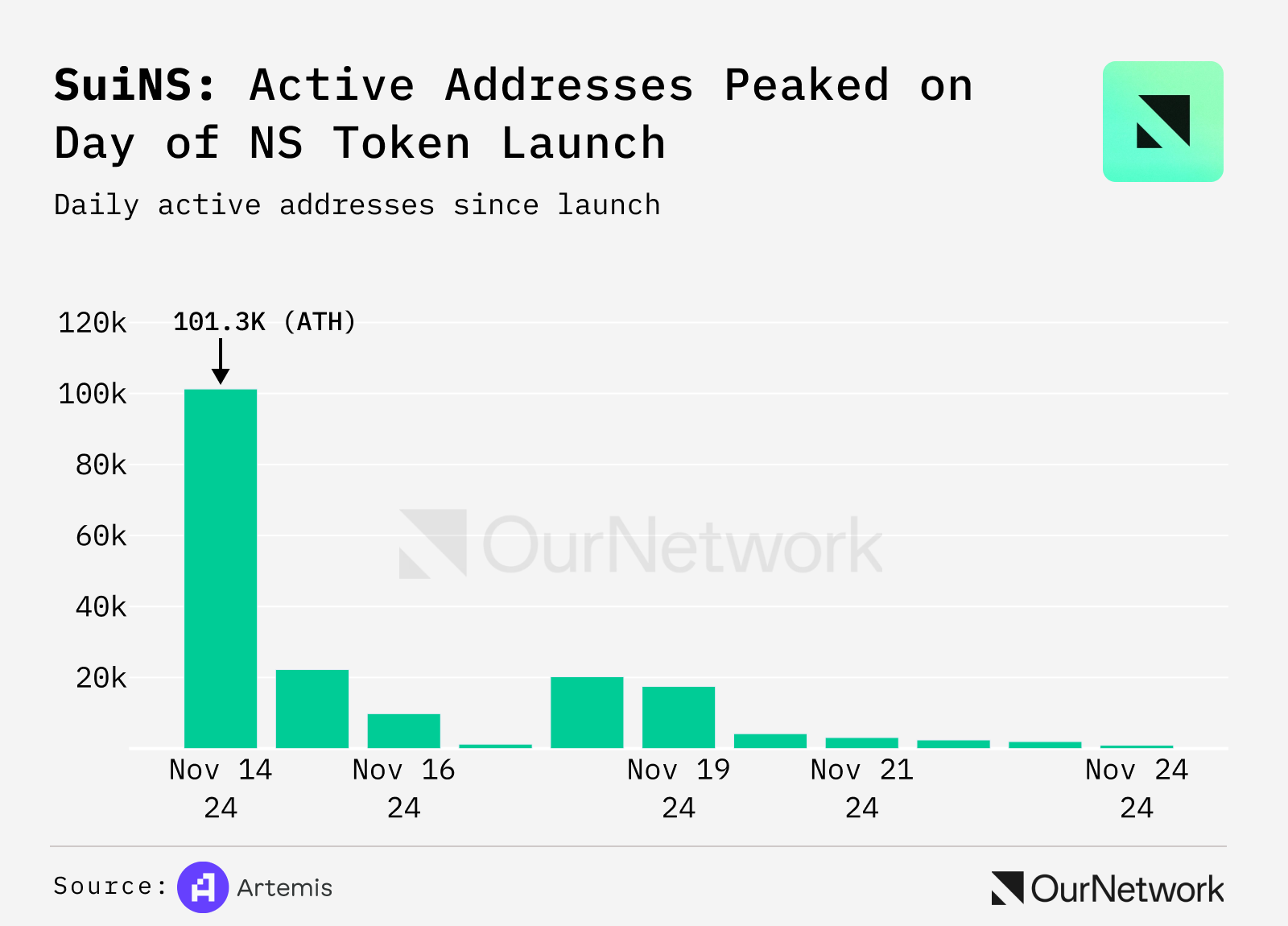 2024 年 11 月 14 日,NS Token 正式上线,标志着 SuiNS 社区治理机制的开启。在总量为 5 亿的 $NS Token 中,10% 被空投给了活跃社区成员,激励他们积极参与生态建设。NS Token 的推出为治理框架注入了活力,使持有者能够共同规划平台的未来发展方向。在 Token 上线当天,活跃地址数创下新高,突破 10 万。此外,自那时以来,基于 SuiNS 合约的交易量已超过 20 万笔,展现了生态的快速发展。