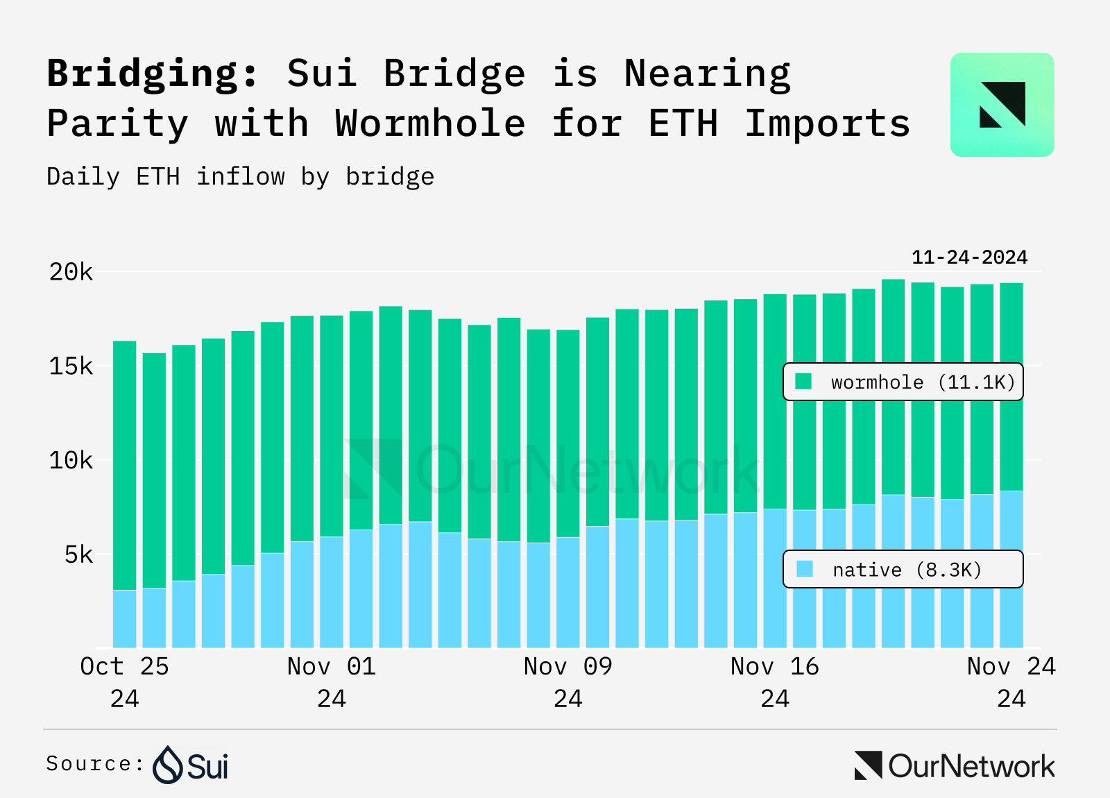 Sui Bridge 于 2024 年 9 月底正式上线主网,为用户提供了一个原生的资产跨链桥接渠道,可在 Sui 和以太坊之间安全地转移资产,并由 Sui 网络的验证节点提供安全保障。自上线以来,通过 Sui Bridge 的 ETH 日流入量持续增长,相比 Wormhole 的流入量逐渐占据更大比例,目前已占到 Sui 每日 ETH 流入量的约 43%,显示出其在生态系统中的重要地位。