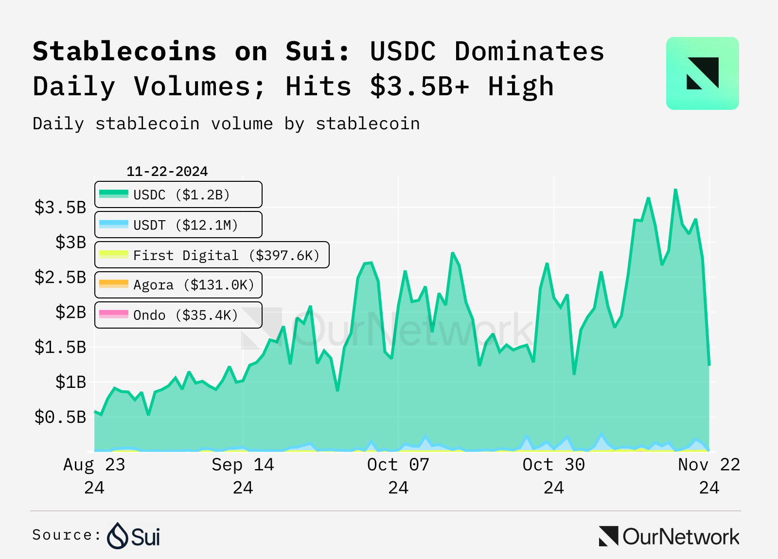 Sui 稳定币生态的持续扩展正在为 DeFi 带来深远影响,并为生态系统创造了更多可能性。其中,USDC 表现尤为突出,11 月中旬日交易量突破 30 亿美元,稳居稳定币交易量榜首。USDT 的表现同样稳定,为生态的稳步增长提供了支持。而 Agora 和 Ondo 等较小的稳定币也为生态注入多样性,反映出 Sui 上健康且不断扩展的稳定币格局。最新加入 Sui 生态的稳定币是由 First Digital Labs 发行的 fdUSD,进一步丰富了稳定币选项。