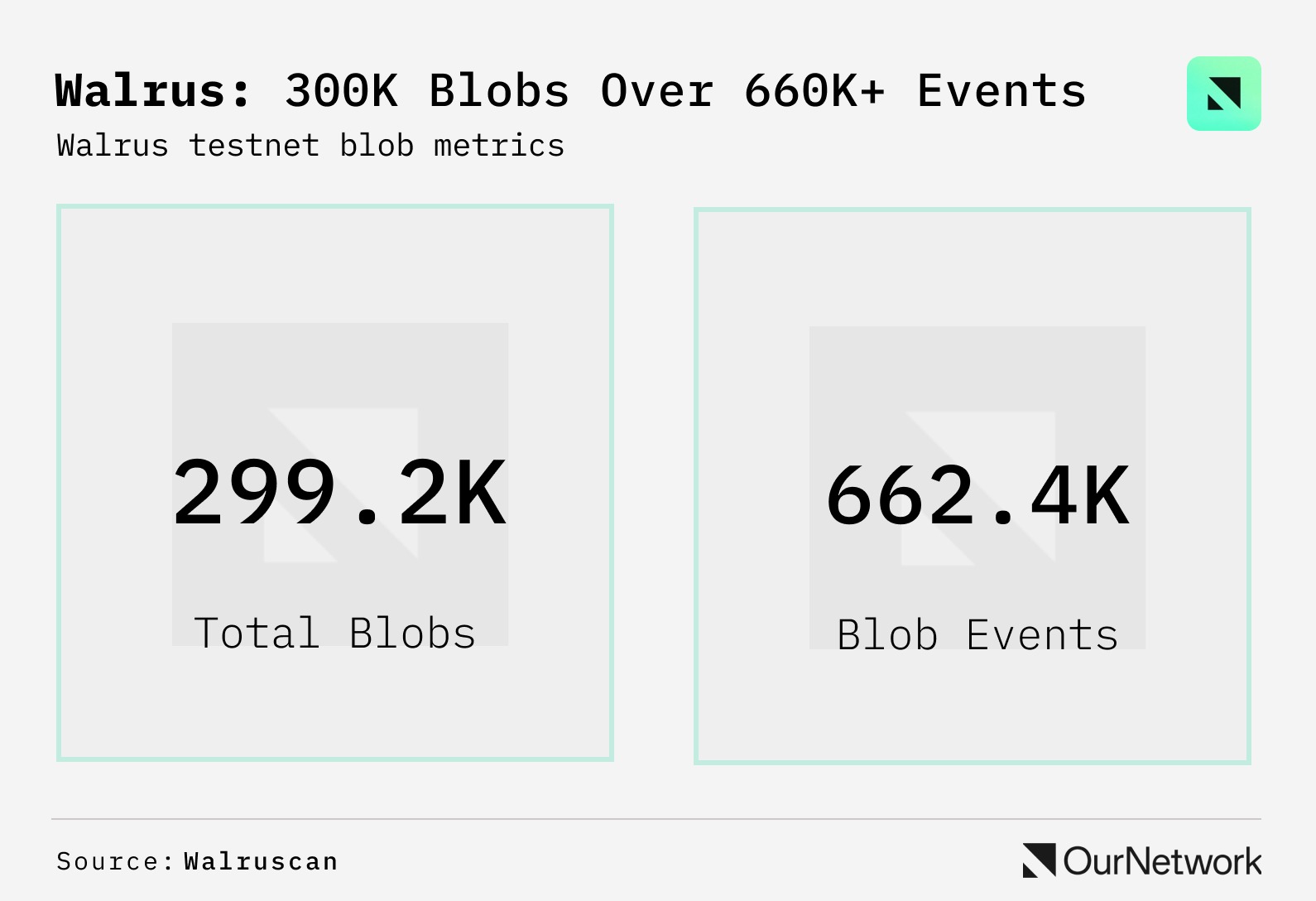Walrus 是一个基于 Sui 网络的去中心化存储与数据可用性协议,目前正在测试网运行。它专为高效处理非结构化数据 (Blob) 而设计,能够以极快的速度和高效能存储海量数据,为分布于独立节点网络中的可扩展、高弹性存储提供了坚实基础。自 2024 年 10 月 17 日测试网上线以来,Walrus 已存储近 30 万个 Blob(单个非结构化数据对象),并触发了超过 66 万次相关操作事件,展现了强大的数据处理能力。