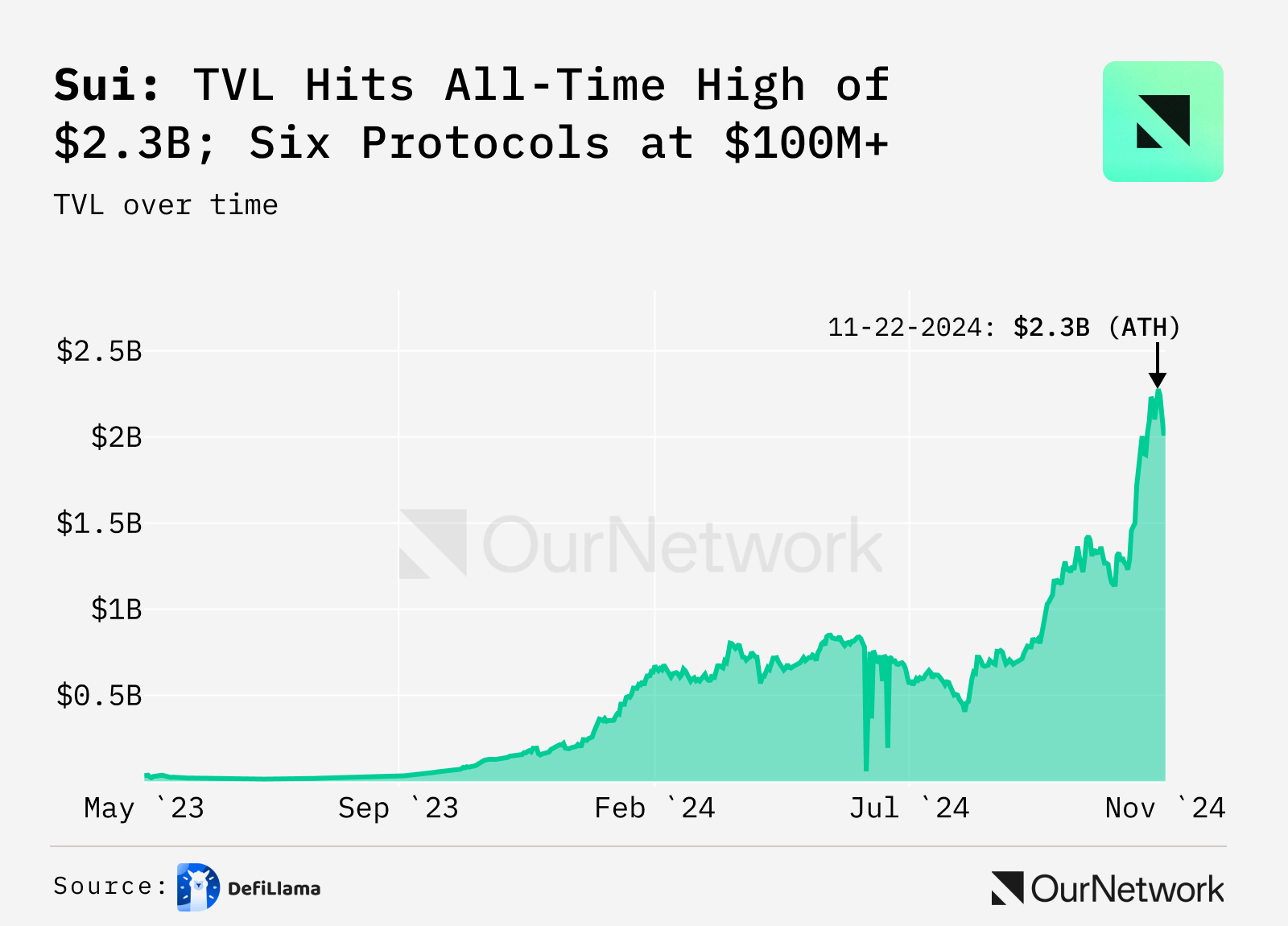 Sui 的总锁仓价值 (TVL) 在 11 月中旬达到历史新高,接近 23 亿美元。在短短 3 个月内,TVL 从 8 月的不到 4 亿美元激增了近 20 亿美元,展现了生态系统的快速扩张和用户的广泛采用。当前,SUI 的市值已达到 100 亿美元,日交易量约为 2.5 亿美元,Sui 正稳步确立其作为 DeFi 领域重要力量的地位。