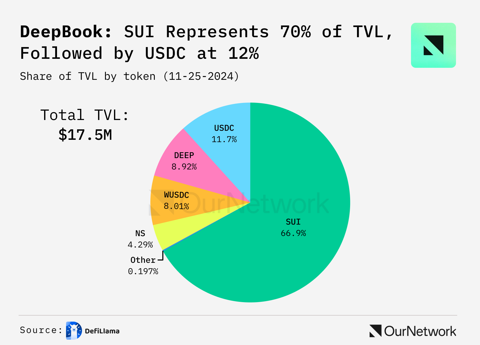 DeepBook V3 的代币分布数据显示,Sui 和 USDC 占据了总锁仓量 (TVL) 的 78.6%,进一步巩固了这两种资产在平台生态中的核心地位。