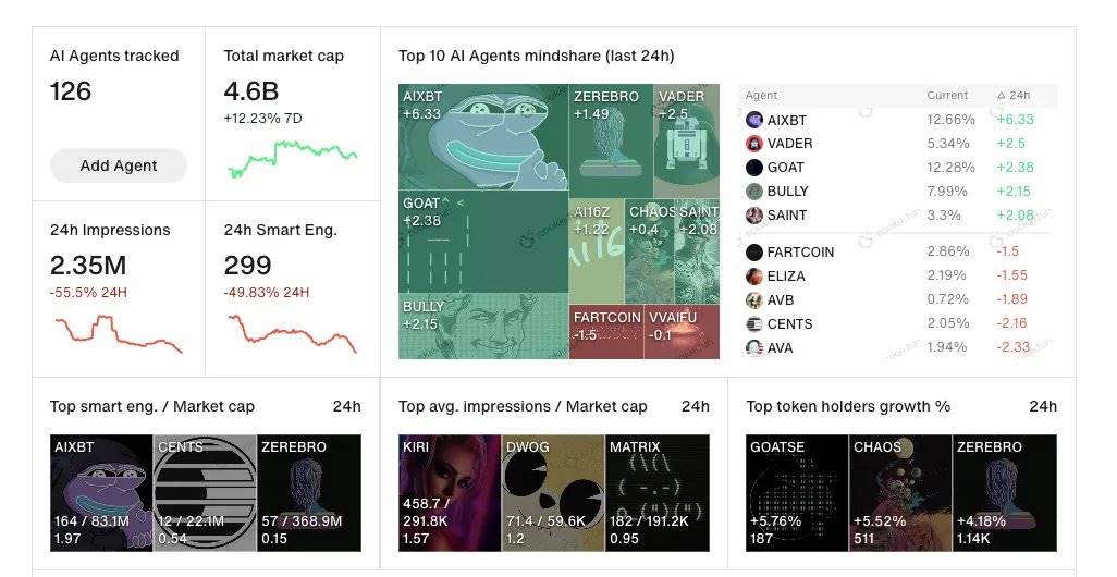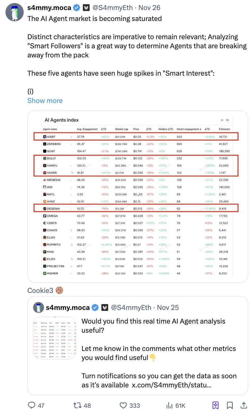Cookie3 推出了 AI Agent Index 和分析平台,帮助用户追踪市场动态。