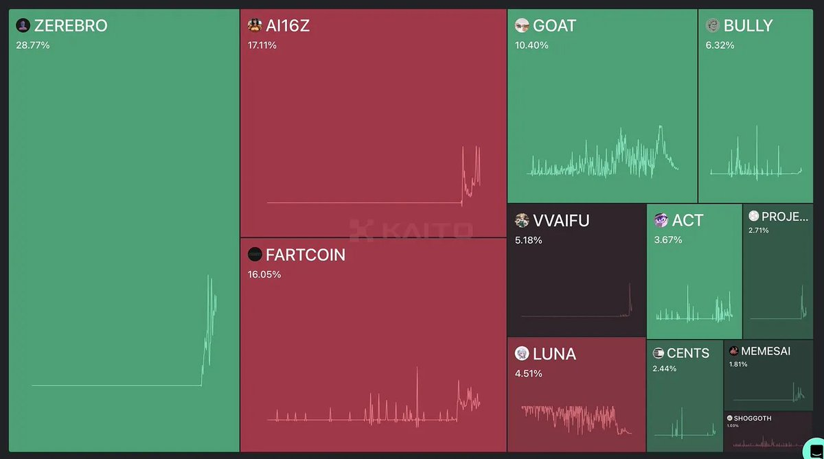 @0xzerebro 的注意力遥遥领先,但其市值仅为 GOAT 的一半,尽管其 Mindshare 是后者的 2.8 倍。