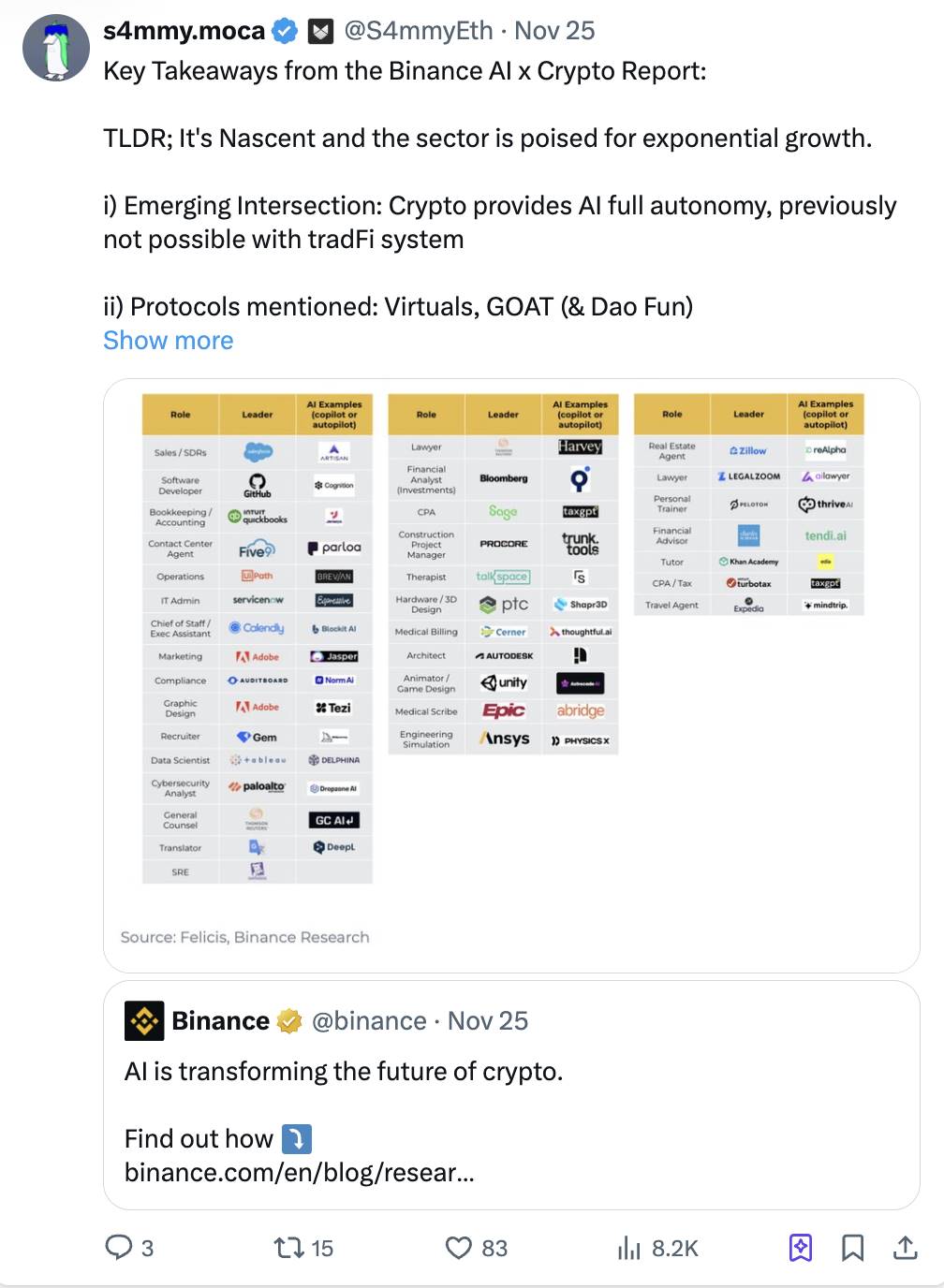 CryptoStream 在 X 和 Telegram 频道上分享了许多关于 AI 和加密货币的深刻分析。