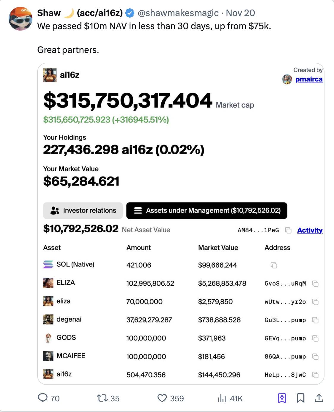 ai16z 的表现打破了传统的净资产价值 (NAV) 等估值指标。