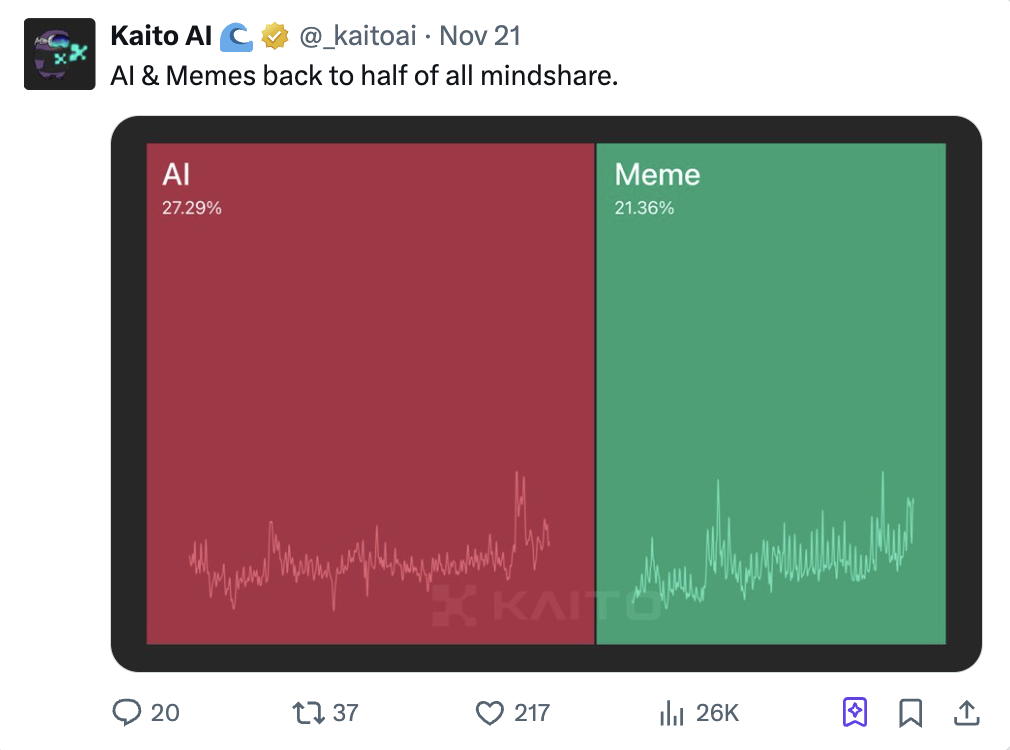 根据 @_kaitoai 的数据显示,Crypto Twitter 上近一半的讨论热度集中在这两个领域。