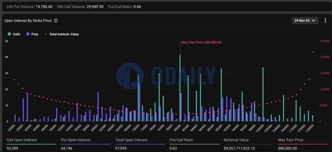 • 期权市场影响:11月29日,价值约104.08亿美元的BTC和ETH期权将到期交割,其中BTC的最大痛点价格为80000美元,ETH的最大痛点价格为2900美元。期权到期可能会引发价格的大幅波动,但我们预计市场将很快稳定,并为比特币的进一步上涨奠定基础。