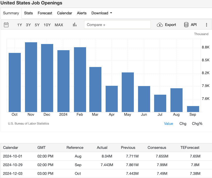 预期情况:10月职位空缺预计从9月的744.3万小幅回升至749万。如果数据继续下降,将表明就业市场进一步降温。