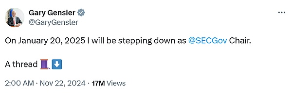我们知道,SEC主席根斯勒近年来的严格监管政策一度让许多加密项目深陷困境,他也因此被称为为“加密公敌”。然而,随着根斯勒即将在2025年1月卸任的消息传出,市场对更友好监管环境的期待被点燃,更重要的是,这也意味着Ripple与SEC之间旷日持久的法律纠纷有望迎来解决。